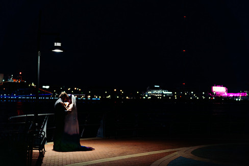 To end the night, we stopped at Friendship Fountain, one of Jacksonville’s most iconic landmarks. The illuminated fountain created the perfect backdrop for more silhouette shots, making for a dramatic and artistic finish to this incredible wedding session.