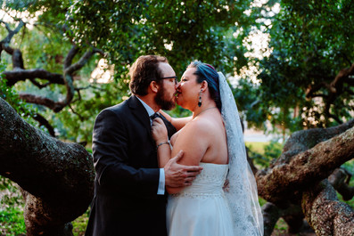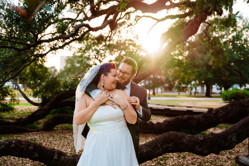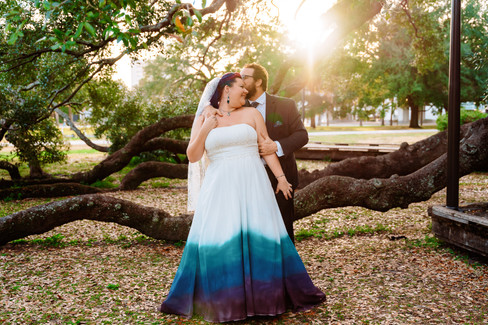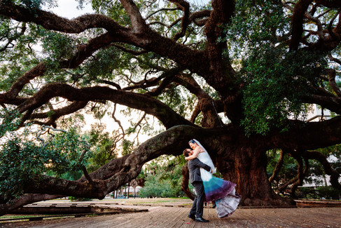 They chose Treaty Oak in Jacksonville, FL, as the setting for this unforgettable session, and it could not have been more perfect. This ancient tree, estimated to be over 250 years old, is a hidden gem tucked away in the heart of downtown Jacksonville. Its massive branches stretch out gracefully, creating a breathtaking canopy that provides the perfect romantic backdrop for wedding photography. With the golden sun setting behind them, I was able to capture dreamy, backlit portraits that radiated warmth and love.